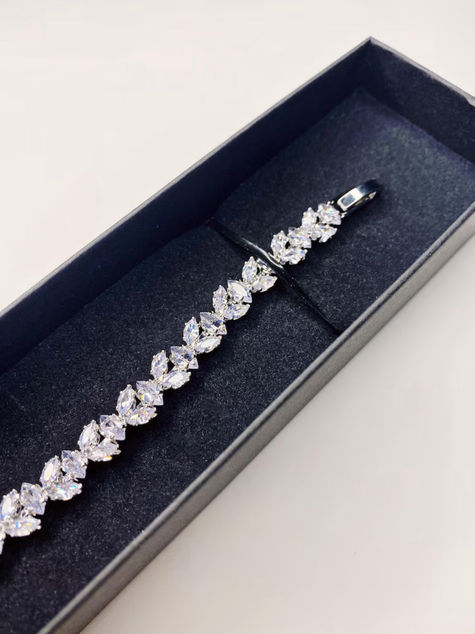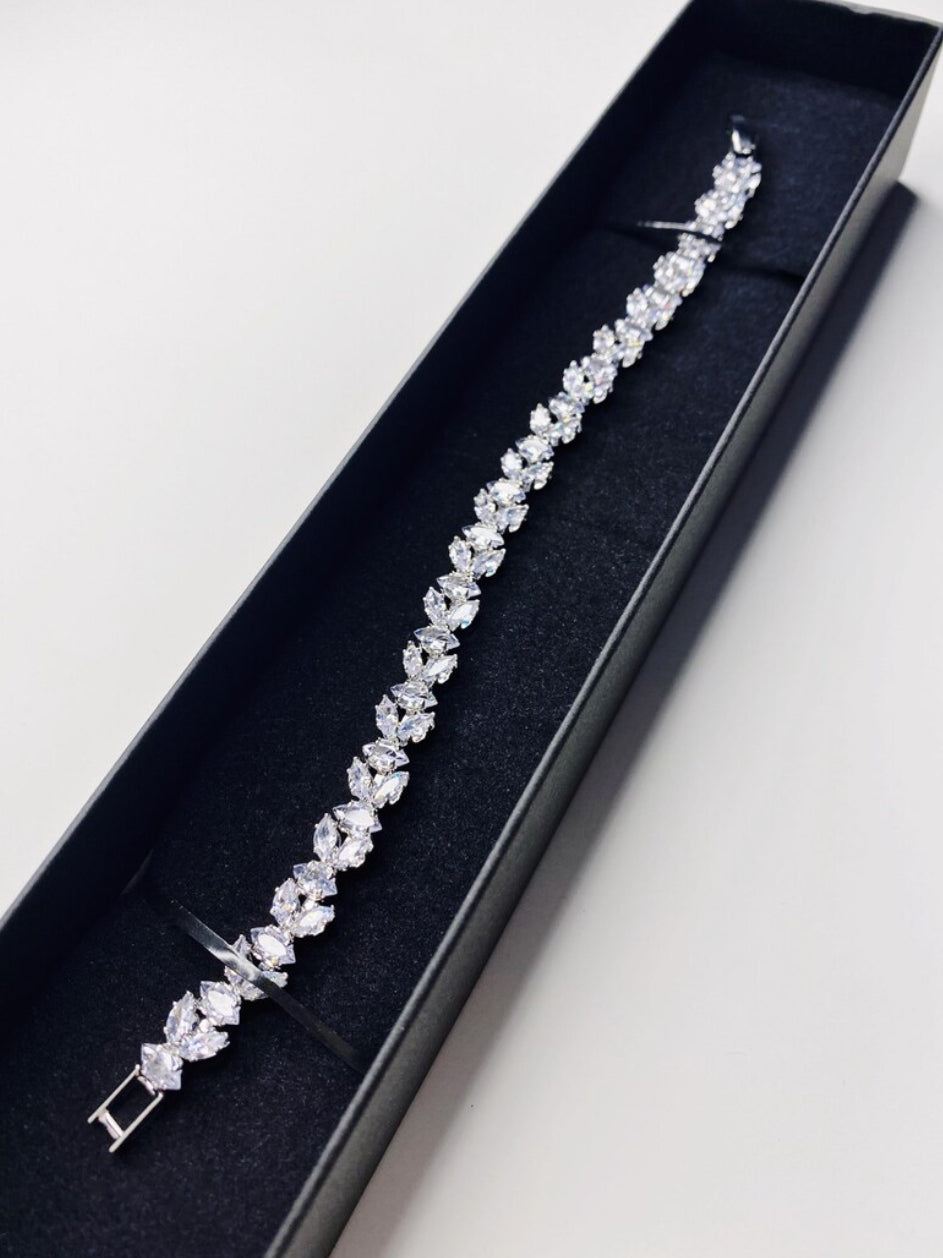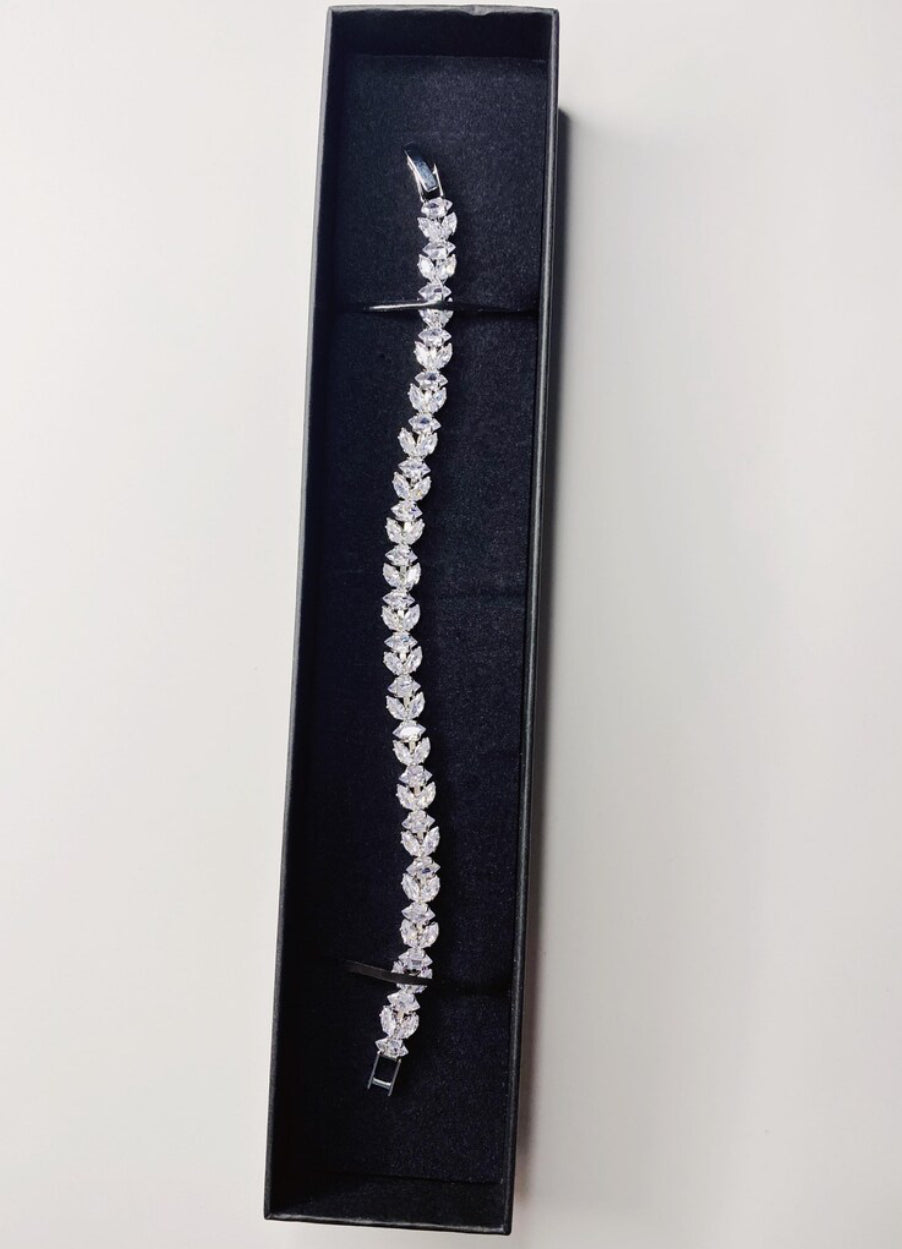 This stunning Silver crystal tennis bracelet adds elegance to any outfit. The intricate twist design and sparkling crystals create a timeless piece that is perfect for any occasion. Elevate your style with this sophisticated bracelet.